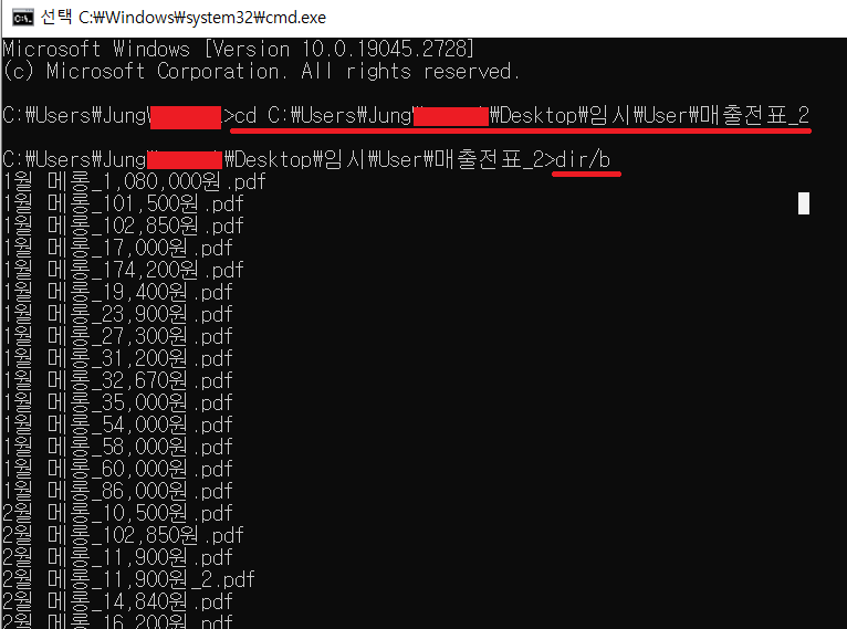 * ex) cd C:\Users\Jung\Desktop\임시\User\매출전표_2\