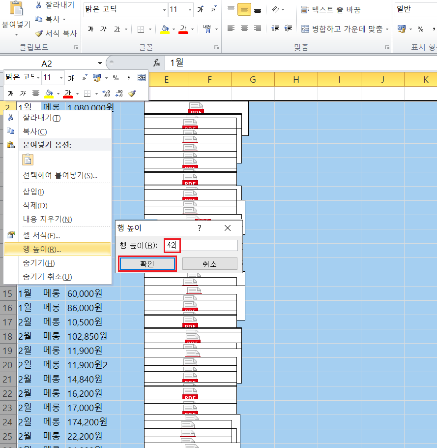 제가 알려드린 소스는 행높이 42 기준입니다. 열너비는 파일 이름에 따라서 달라지니 Pass 할게요