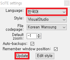 복사가 완료 후 SciTE.exe를 실행, 상단에 탭 중 Tools → SciTE4AutoHotkey settings로 들어가셔서 아래 사진과 같이 변경 후 update 버튼 클릭