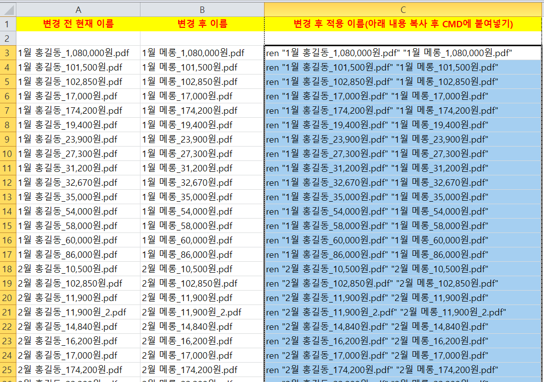 4. 변경하고 싶은 행(2번째 행) 옆에 3번째 행에 ="ren "&""""&A3&""""&" """&B3&"""" 기입