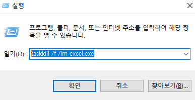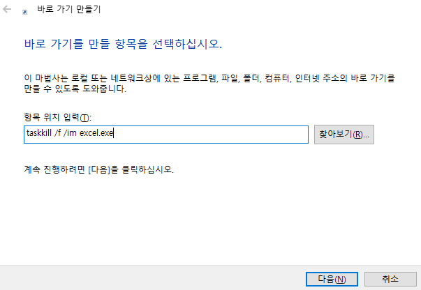 생성되는 화면에 Taskkill /f /im excel.exe 입력 후 다음-마침 눌러주시면 바탕화면에