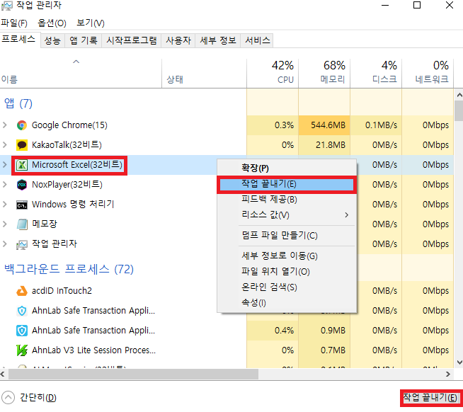 프로그램 렉 걸렸을 경우 프로세스 강제종료 하면 거의 몇 초 내에 바로 종료 돼요!