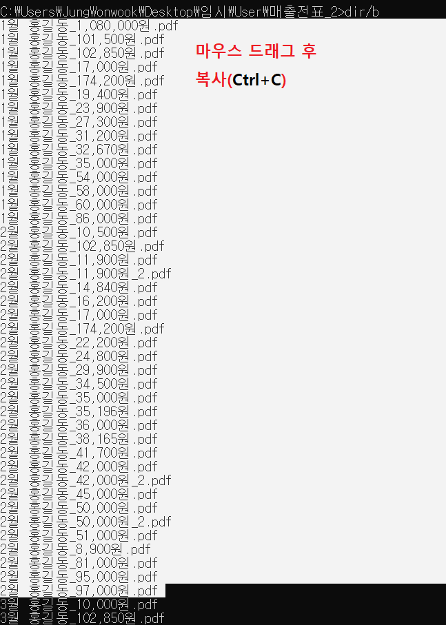 * 파일명을 텍스트 파일로 저장하고 싶으신 경우 dir/b > List.txt 기입 시 List.txt 파일이 생성되고 안에 파일명들이 기입됨.