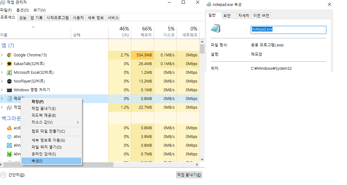 Ctrl+Alt+Delete 눌러서 작업관리자 들어가신 후 프로세스 알고싶은 프로그램 우클릭 후 속성 눌러주세요